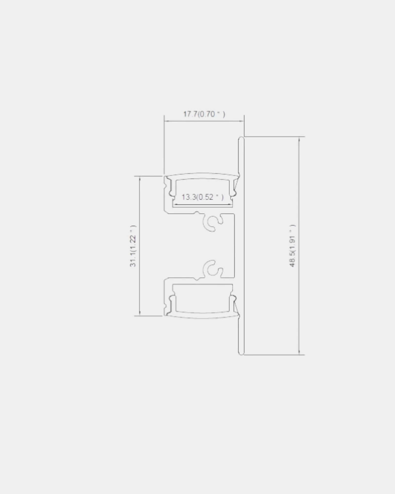 Generous 17.7 × 48.5 mm Profile: Tall, architectural scale with 13.3 mm central channel for dual LED strip mounting.
